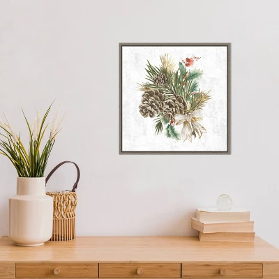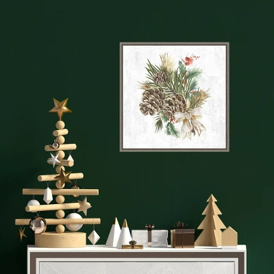 ART DESCRIPTION: This realistic print of a holiday greenery sprig has a traditional look. With holly, pinecones, and an evergreen tree branch bound by a festive gold bow, this image can complete your seasonal decorations with style. This Amanti Art canvas art print was created by PI Studio and printed by Amanti Art in Madison WI. The canvas is stretched by hand and finished with a float frame. Individually made using traditional custom framing techniques, it has the quality you would expect from your local frame shop. Because of our attention to detail and focus on artistry, architects, interior designers, and homeowners alike choose this framed canvas artwork to create beautiful living spaces.