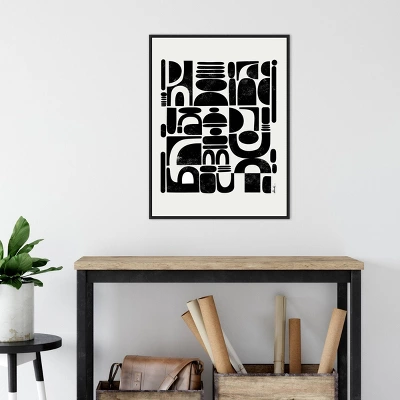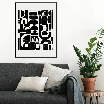 ART DESCRIPTION: A black and white grid of ovals, half-circles and curved lines spreads across the image foreground. Each square in the grid contains a set of shapes. They alternate colors: White squares hold black shapes and black squares hold white shapes. This Amanti Art canvas art print was created by Ishita Banerjee and printed by Amanti Art in Madison WI. The canvas is stretched by hand and finished with a float frame. Individually made using traditional custom framing techniques, it has the quality you would expect from your local frame shop. Because of our attention to detail and focus on artistry, architects, interior designers, and homeowners alike choose this framed canvas artwork to create beautiful living spaces.