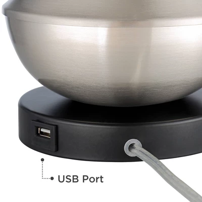 A collection of dynamic features merge to create a must-have light pair in this set of two metal accent table lamps. Designers at 360 Lighting pulled out all the stops to produce a visually captivating look made from metal and given an alluring contoured body. Half-moon glass shades complete a sophisticated, balanced look. Twin pull chain switches allow access to on-off operations from both sides, and a bonus USB port and a plug outlet on each base offers tech convenience.
