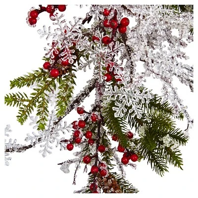 Simple, yet stunning, this berry and boxwood arrangement gives hint to the holidays with rich red and green hues. Place tabletop for a holiday dinner party, or place bedside with flickering candles and seasonal novels for a wintertime display. Includes glass jar with faux water.