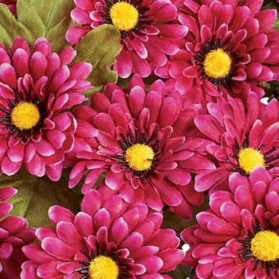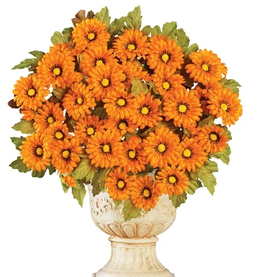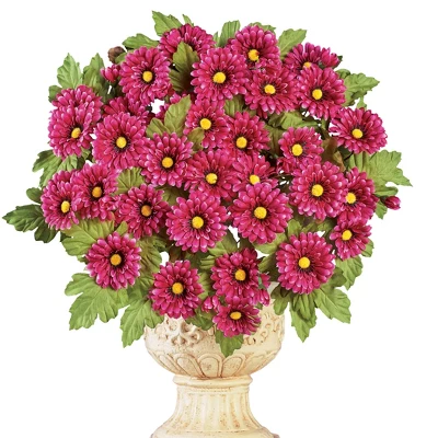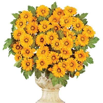These beautiful flowers are the perfect way to add seasonal color indoors or out. Set includes 3 full bunches of chrysanthemums in your choice of yellow, orange or magenta. Use them in your planters or stake them directly into the ground in your garden (planter not included). Use separately for smaller bouquets or all together, as shown, for a bold and beautiful arrangement. Plastic and polyester; imported. Each bunch is approx. 9″Dia. x 17″H. Choose: Yellow, Orange or Magenta. Set of 3.