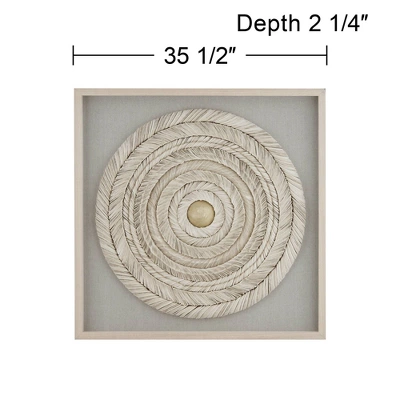 - 35 1/2″ wide x 35 1/2″ high x 2 1/4″ deep. Hang weight is 24.69 lbs.