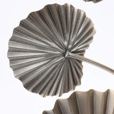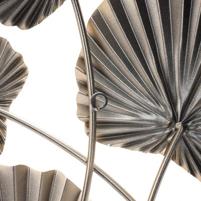 Brighten bare walls with this eye-catching sophisticated gold palm leaf wall decor. Use this gold wall decor to add color and elegance to a hallway or room. The seven overlapping palm leaves have a fan design that makes it an intriguing and eye-catching addition to any contemporary-inspired decor. Give your entryway, living room, bedroom, dining room, or office a lift with this stunning one-piece accent wall sculpture, and add personality to empty walls. The metal wall decoration arrives ready to mount vertically with three eye hooks attached to the back of the sculpture. It is a beautiful tropical artistic statement for any living space in your home.