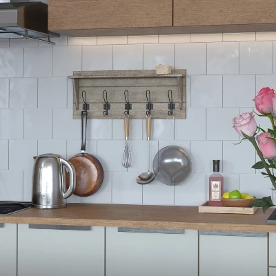 Functional in any space and elegant in any 21st century setting, this wall mounted storage coat rack is the essence of rustic design. Solid pine construction is contrasted by metal hooks that hold up to 10 pounds each for stylish, safe organization while the upper shelf is ideal for décor or to hold small personal belonging.