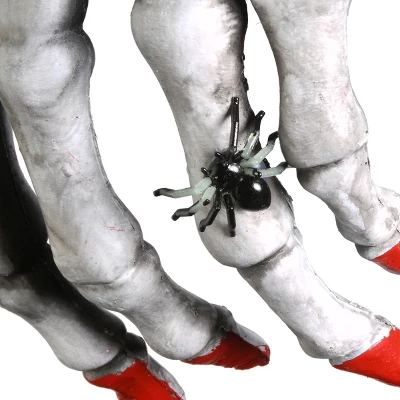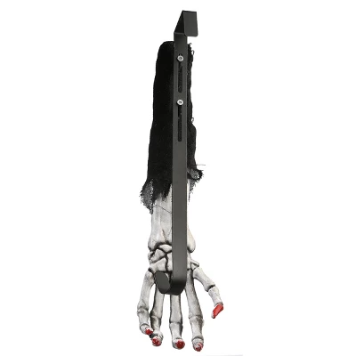 Any Halloween door decoration will be certainly scarier with this helpful hand hanger. Emerging from a frayed black sleeve, a gnarly weathered skeletal hand reaches down in a gruesome grab. The metal hook is rounded at the bottom and square at top for over-door placement. This unique hanger will add some frightening fun to your Halloween decorating theme.