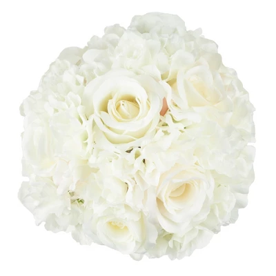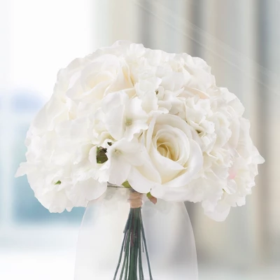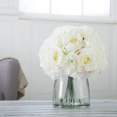 - Arrangement features 10 hydrangeas and 10 roses for a full set and lush appearance