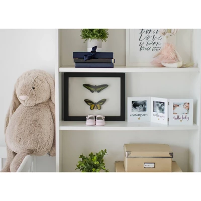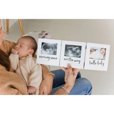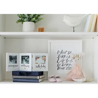 Baby is on the way! Celebrate this special time and your new pregnancy with Pearhead’s sonogram desk frame. This white wooden, hinged keepsake frame is the perfect way to display your pregnancy journey. The frame holds three 2.5″ x 3.5″ pictures; one of your first sonogram, one throughout your pregnancy, and one when baby arrives. To add to the cuteness of this frame, “coming soon,” “on the way,” and “hello baby” are printed below each picture. And to top it off, there’s a gold foil heart stamped below each phrase. The hinges make this frame perfect for fitting on any tabletop or desk. Have fun filling this frame up as you go or putting all the pictures in at once! It also makes the perfect baby shower gift so don’t forget to add this to your registry. You’ll love receiving this gift to be able to cherish every moment of your pregnancy. Celebrate and cherish your pregnancy journey with Pearhead’s sonogram desk frame. Product dimensions: 15″ W x 5.7″ H x .5″ D; Photo inserts: 2.5″ x 3.5″Â