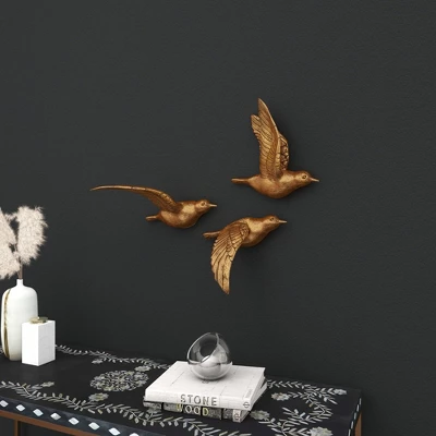 - •Detailed carved bird figurines depicting 3 various flight movements, metallic gold finish throughout each bird wall decor sculpture