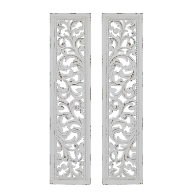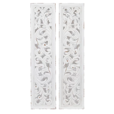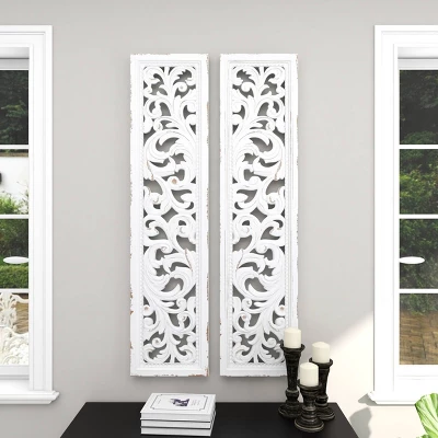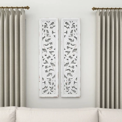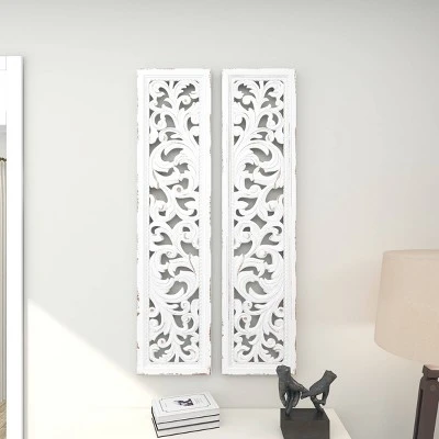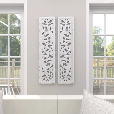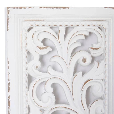 - These rectangular wall decorations are carved with intricate botanical details, white-painted, and given outline distressing for a traditional feel