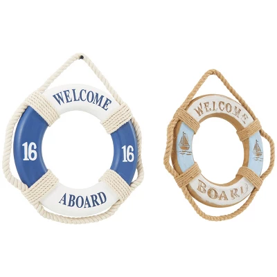 - Wood wall décor set features various coastal tones, with 1 lifesaver featuring sleek blue and white painted wood with cream rope, and the other featuring distressed light blue and cream painted wood with brown rope