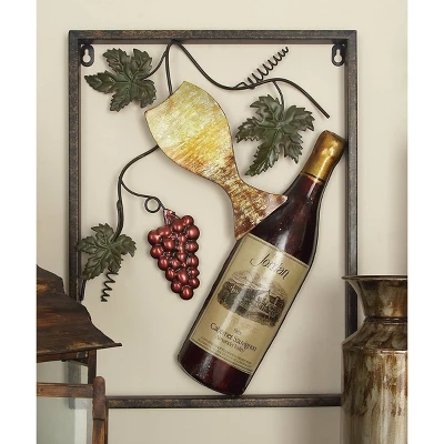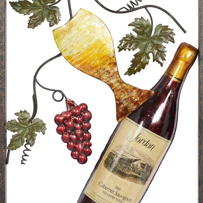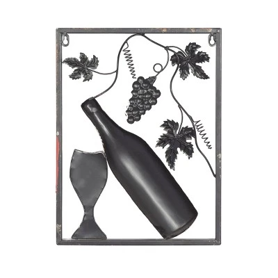 - Design features bottles, grapes, and goblets, features keyhole hangers for easy hanging