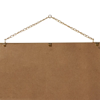 - This chalkboard wall decor features a brown frame, a black writing board, and a gold hanging chain